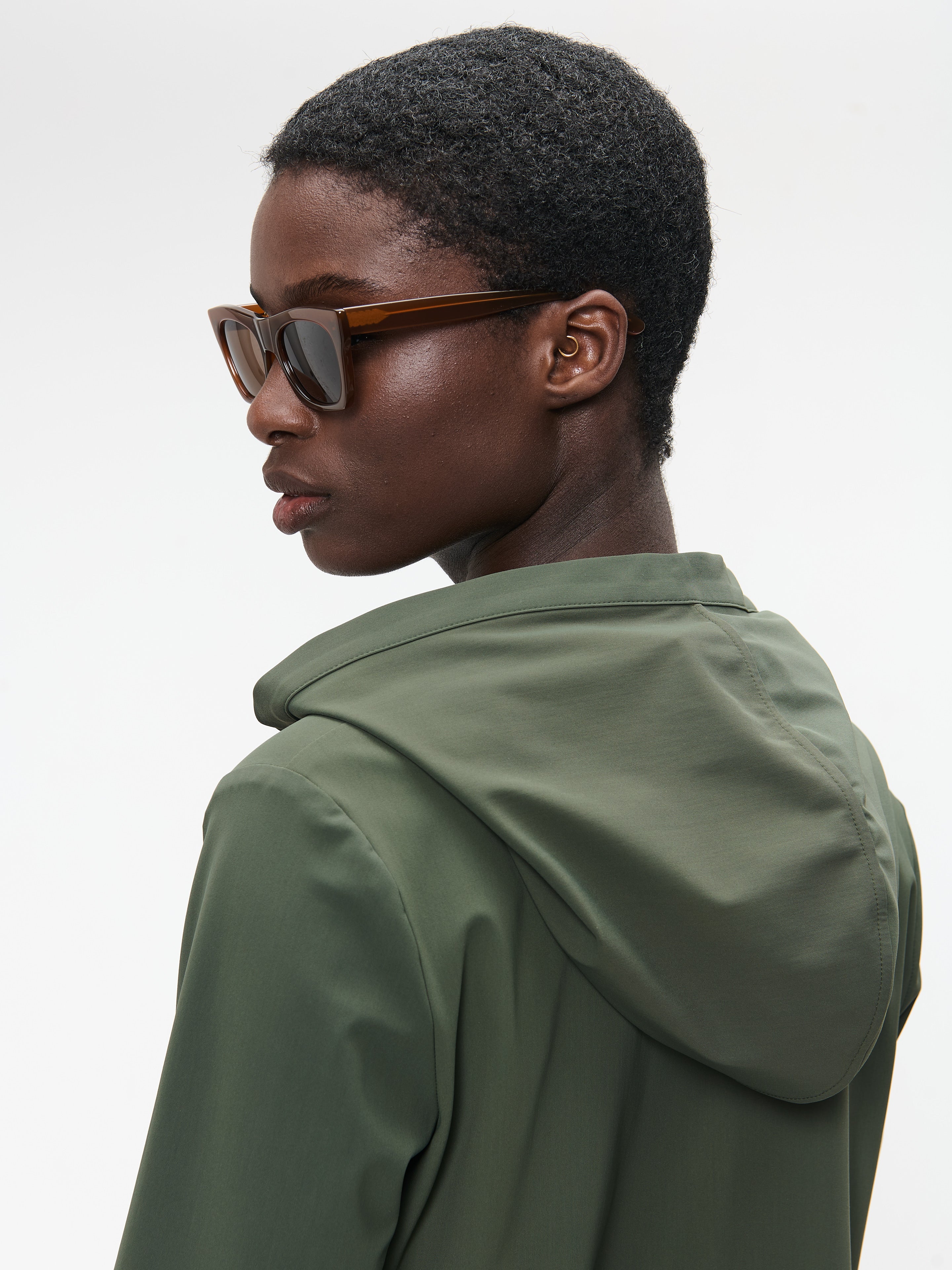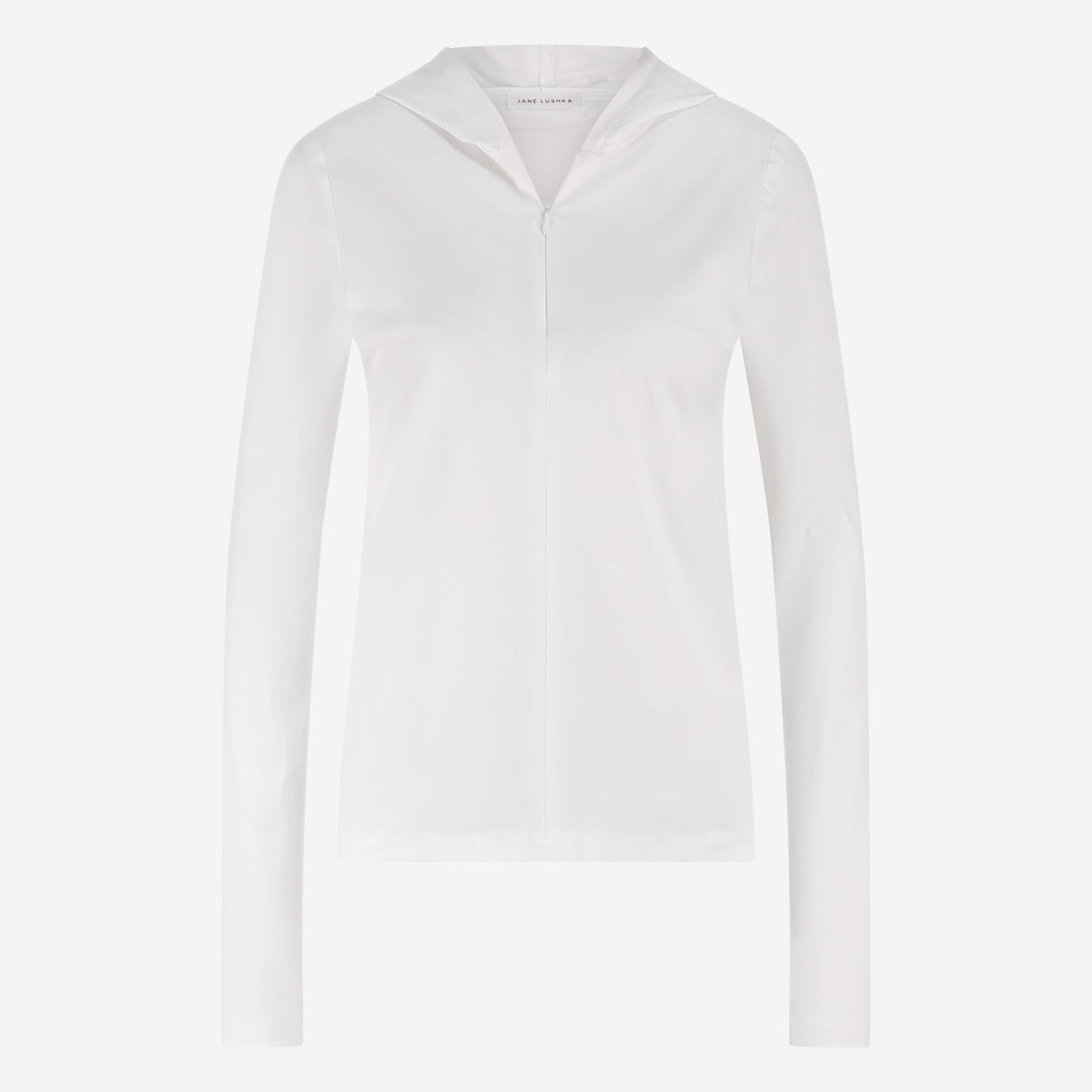 • Halsringning: Myk V-hals med påsatt hette