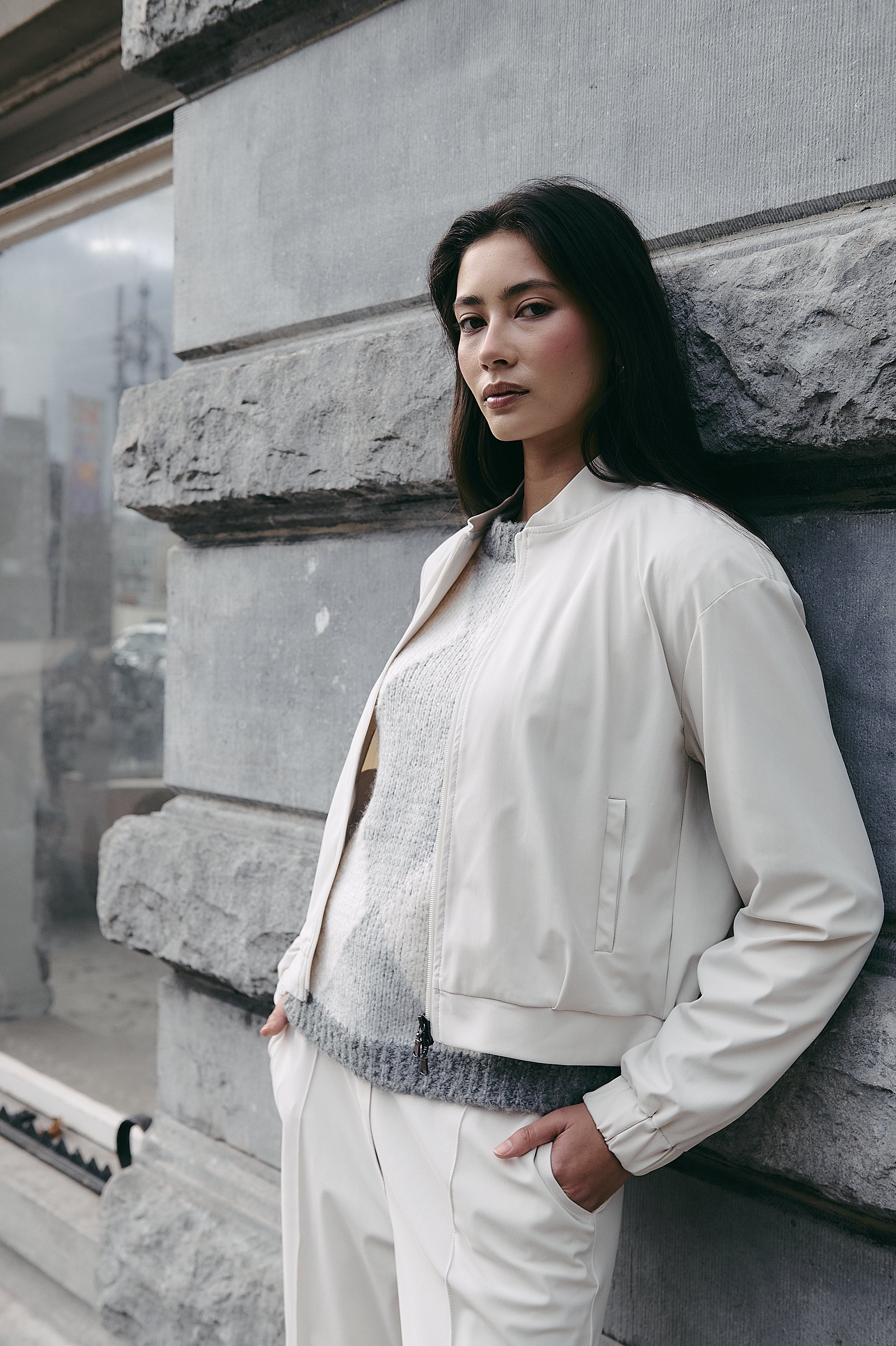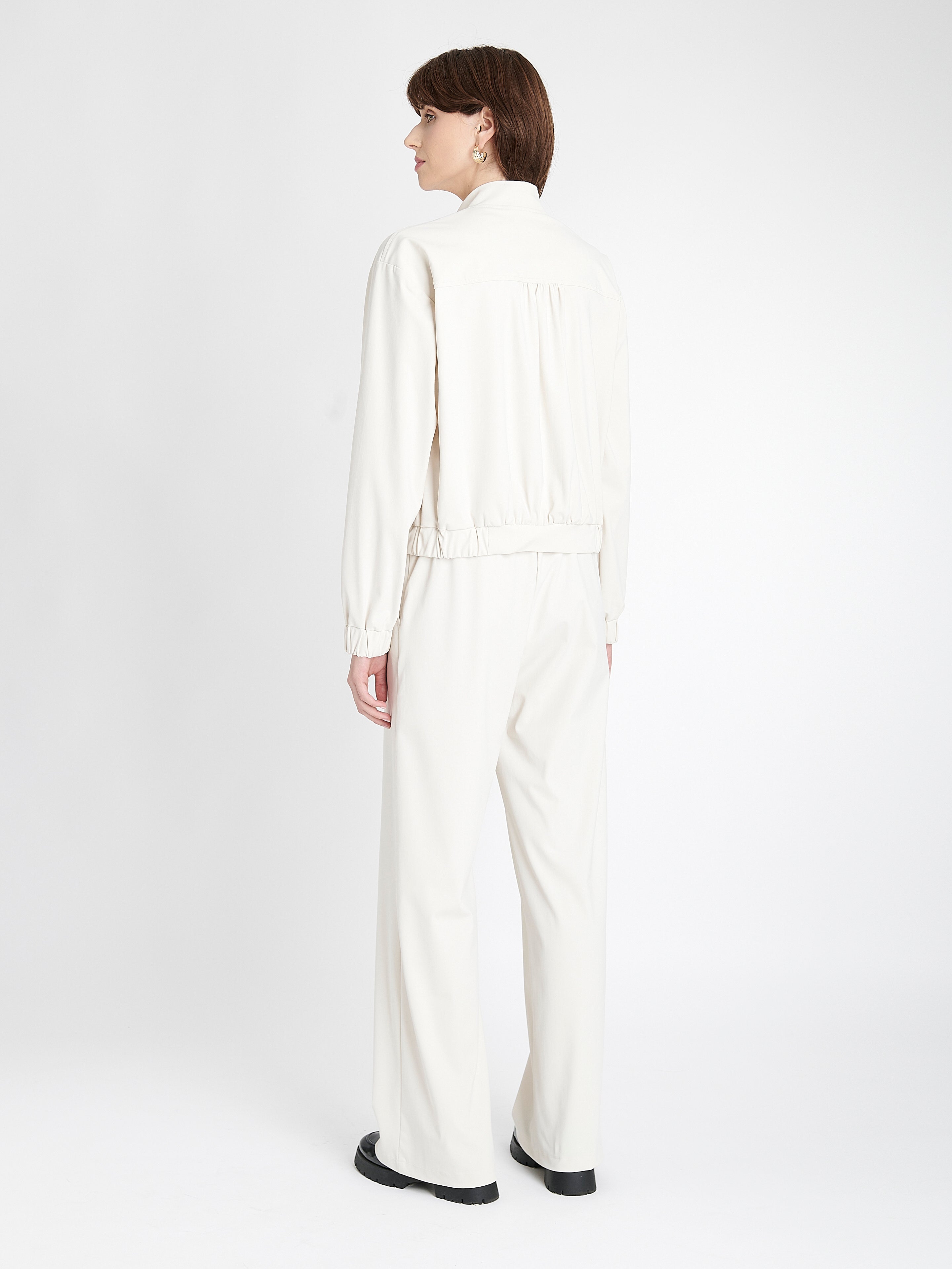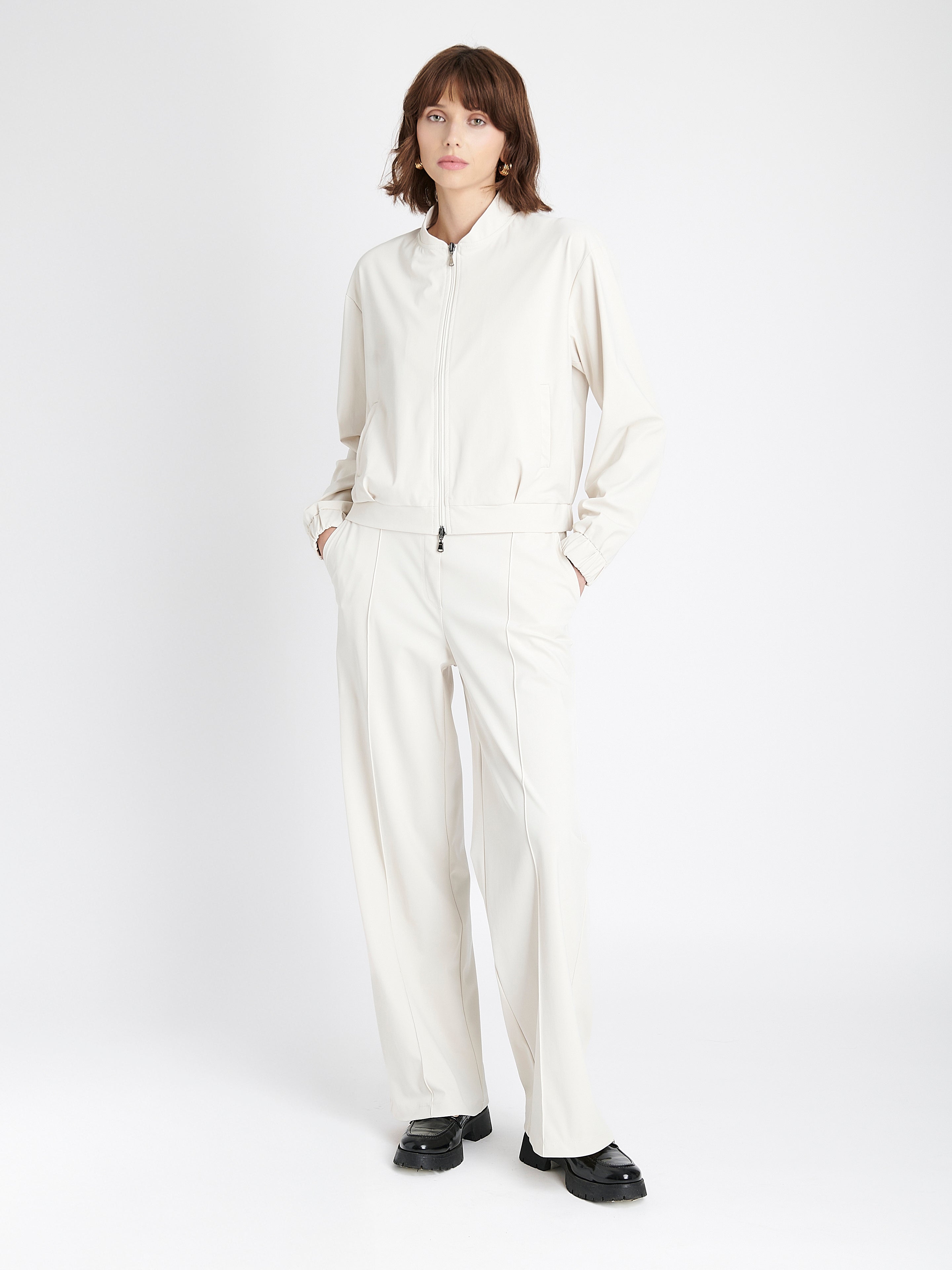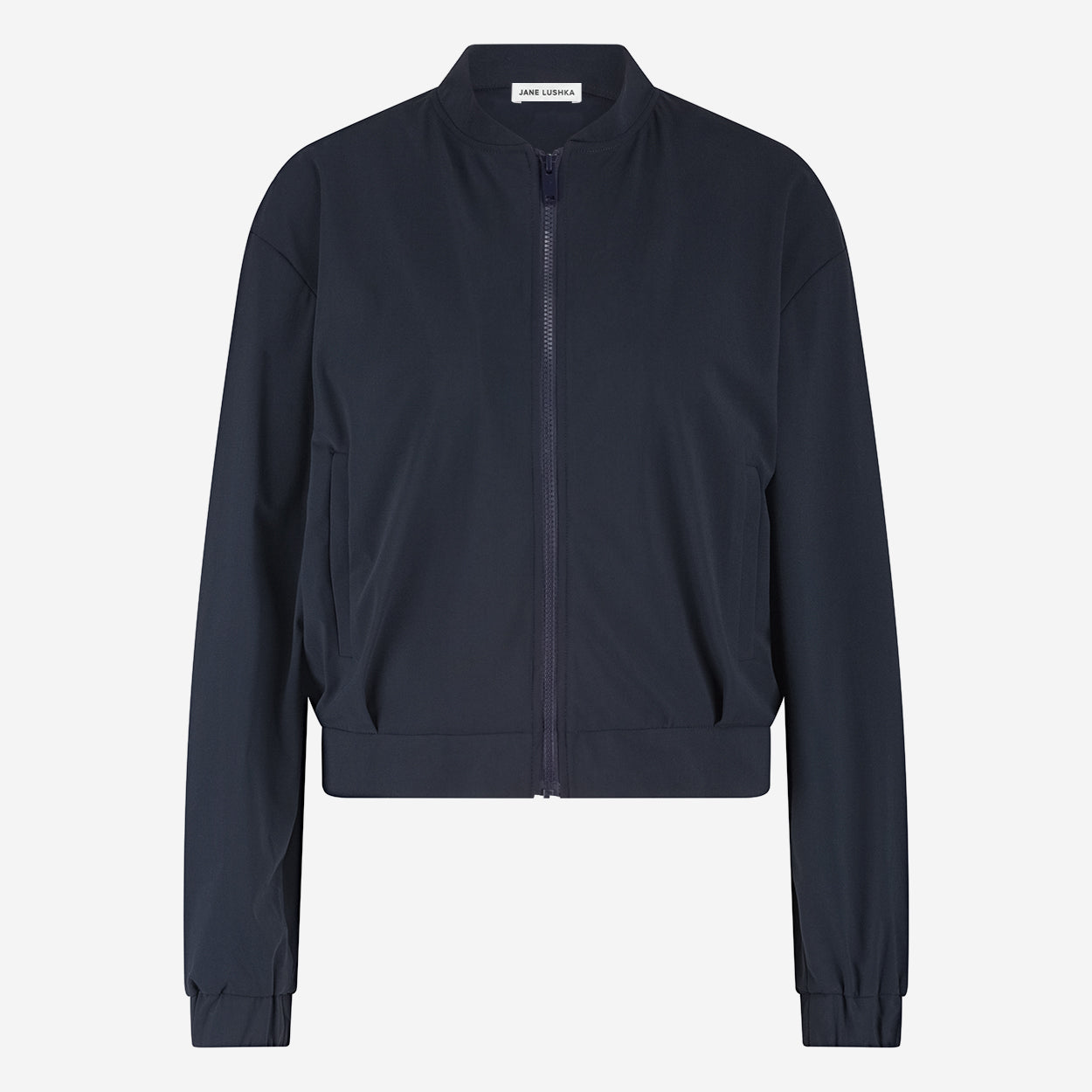 Den er laget i børstet teknisk jersey med en myk og lett fløyelsaktig overflate som føles både luksuriøs og funksjonell. Den minimalistiske kragen, full glidelås og elastiske kanter gir en ren og moderne silhuett. Perfekt å bruke sammen med matchende bukser eller over en kjole.Produktdetaljer