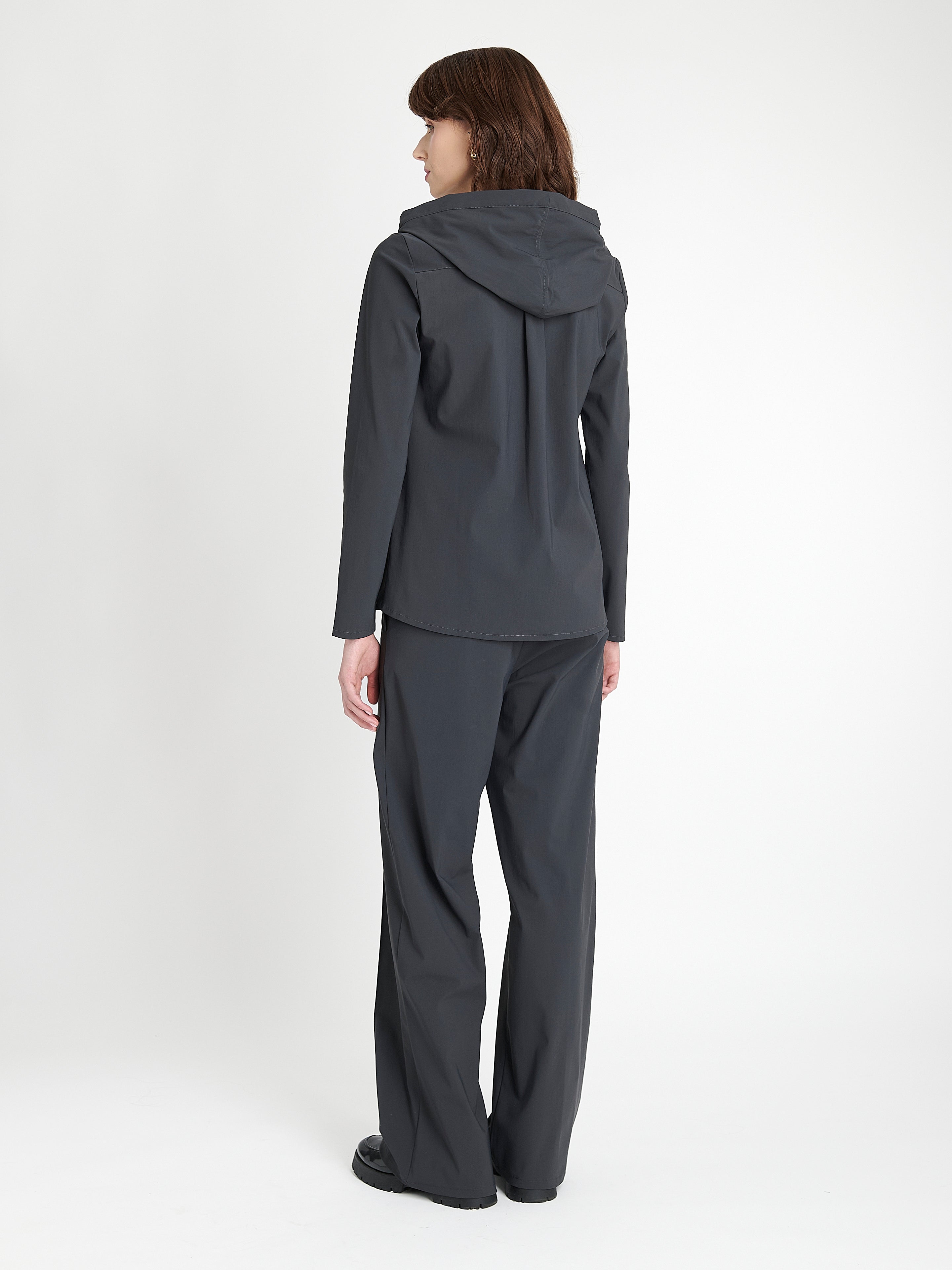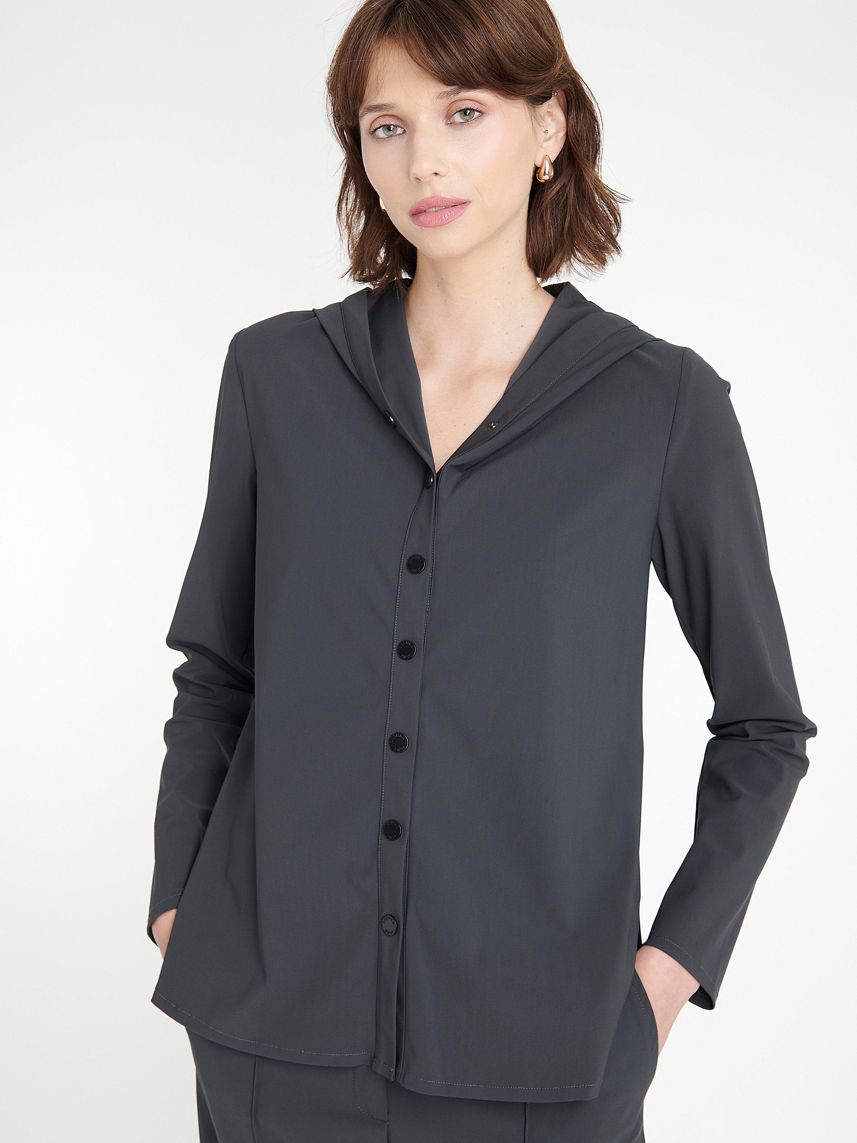 Ready to ship todaySee more detailsDesignet for sofistikert komfort, kombinerer Veronica Technical Jersey Blouse struktur og mykhet i en ren silhuett. Med et moderne kragedesign med mykt drapert hette-detalj, er denne blusen skåret i glatt teknisk jersey for et polert utseende og komfortabel passform. Den lukkes med tonale knapper og har diskrete sidelommer — et minimalistisk men funksjonelt plagg for allsidig styling.