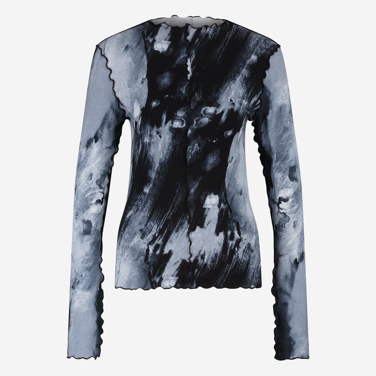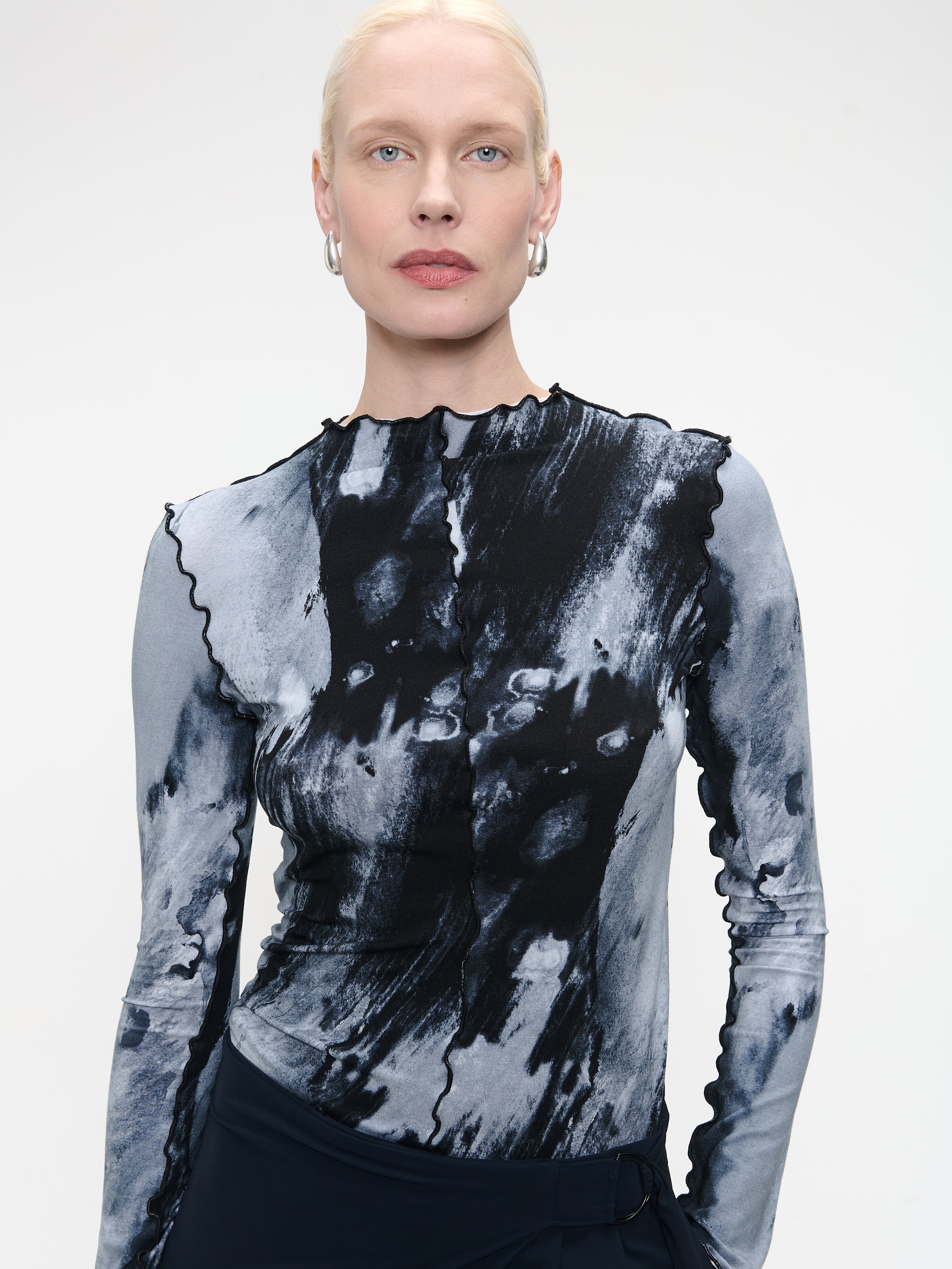 Sesongens blikkfang: Janette allover print topp. Laget av en myk og elastisk viscoseblanding som følger kroppen samtidig som den gir god bevegelsesfrihet. Det iøynefallende trykket og den feminine salatkantdetaljen på ermene og kanten gjør den til et unikt, men anvendelig plagg for hverdag eller spesielle anledninger.