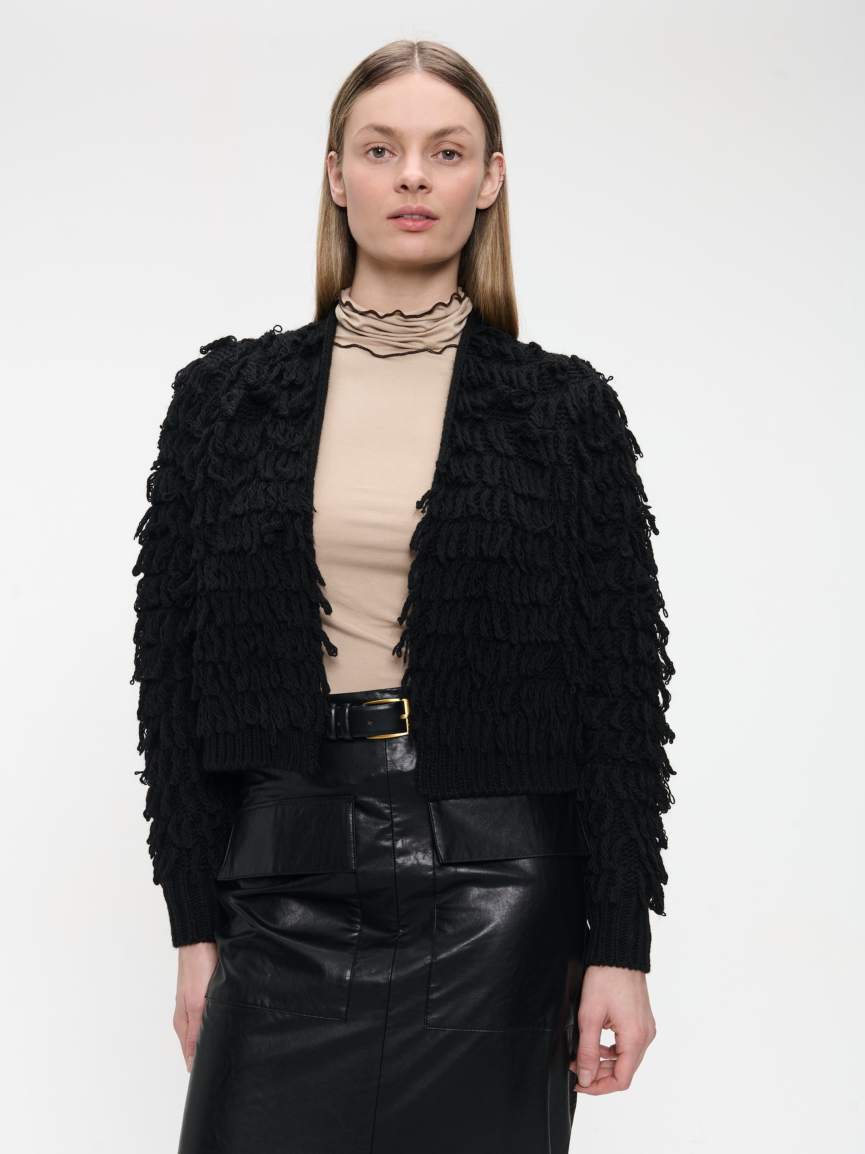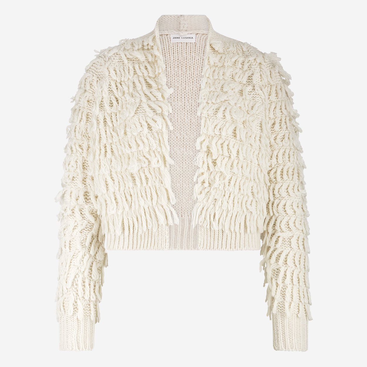 Med frynser over hele designet får du en livlig silhuett, samtidig som plagget er mykt og komfortabelt. Strikket i en blanding av akryl, ull, viskose og alpakka – varmt men lett. Bruk den åpen eller lukket – perfekt både til avslappede og mer oppdressede antrekk.