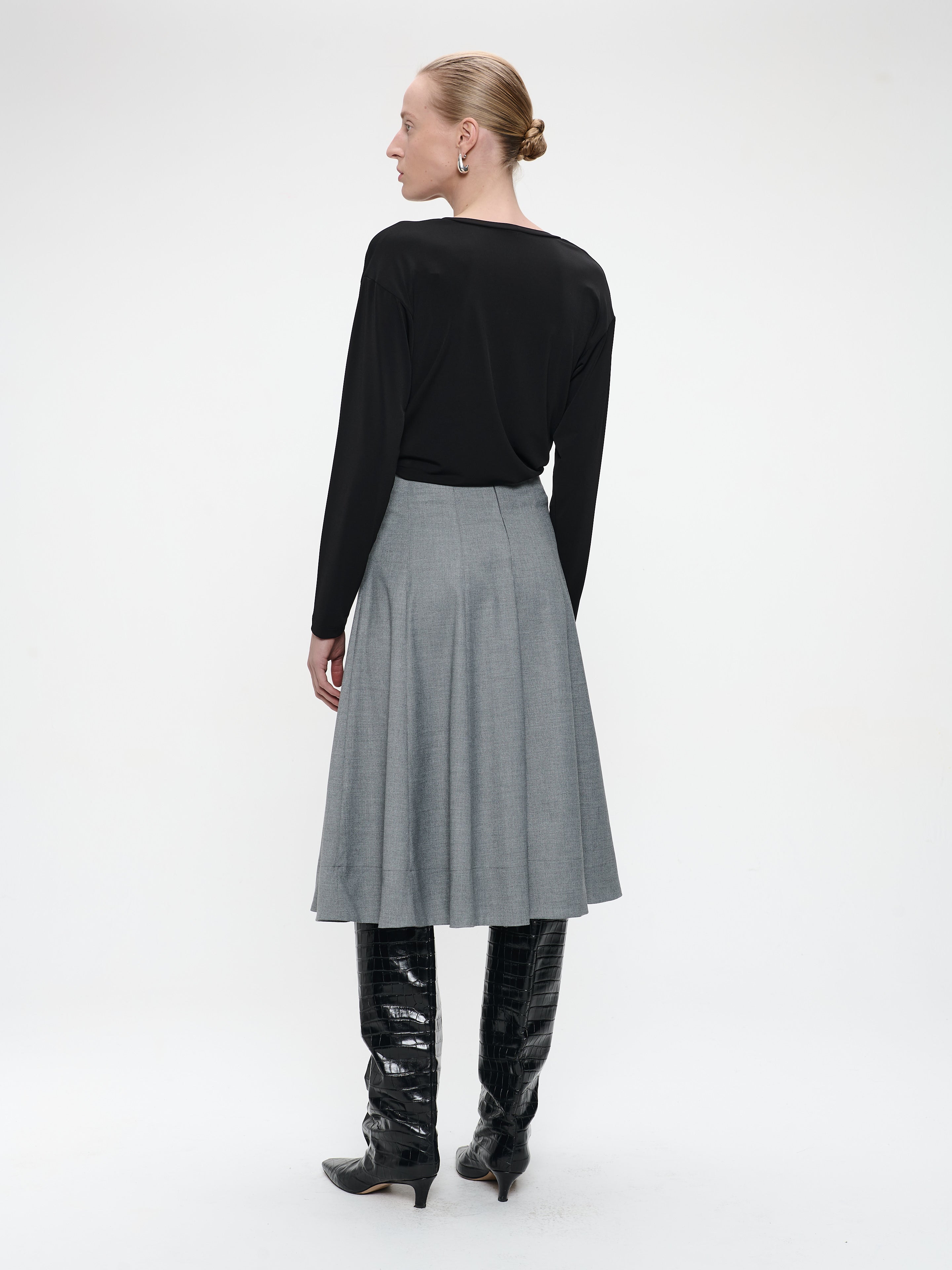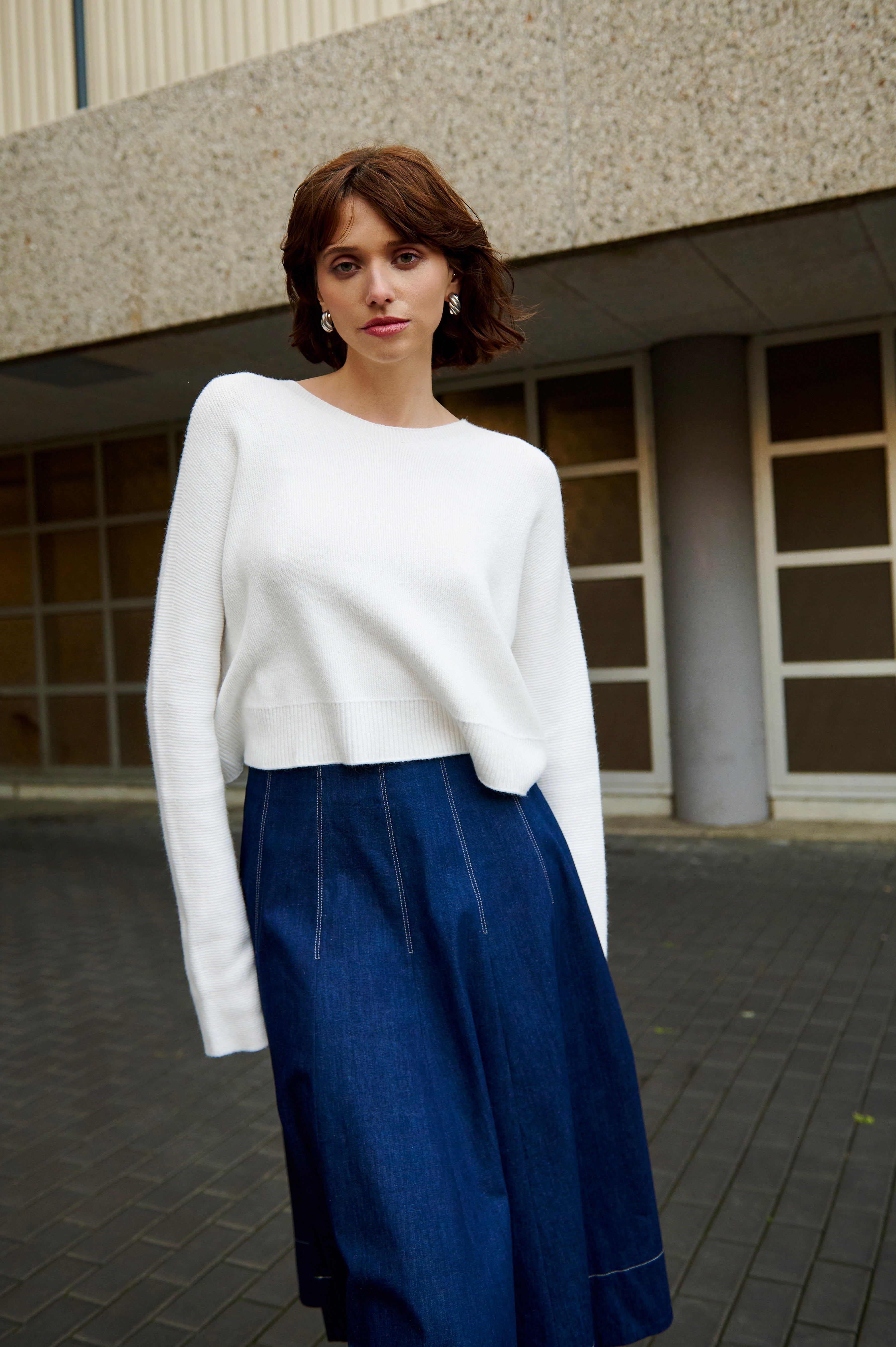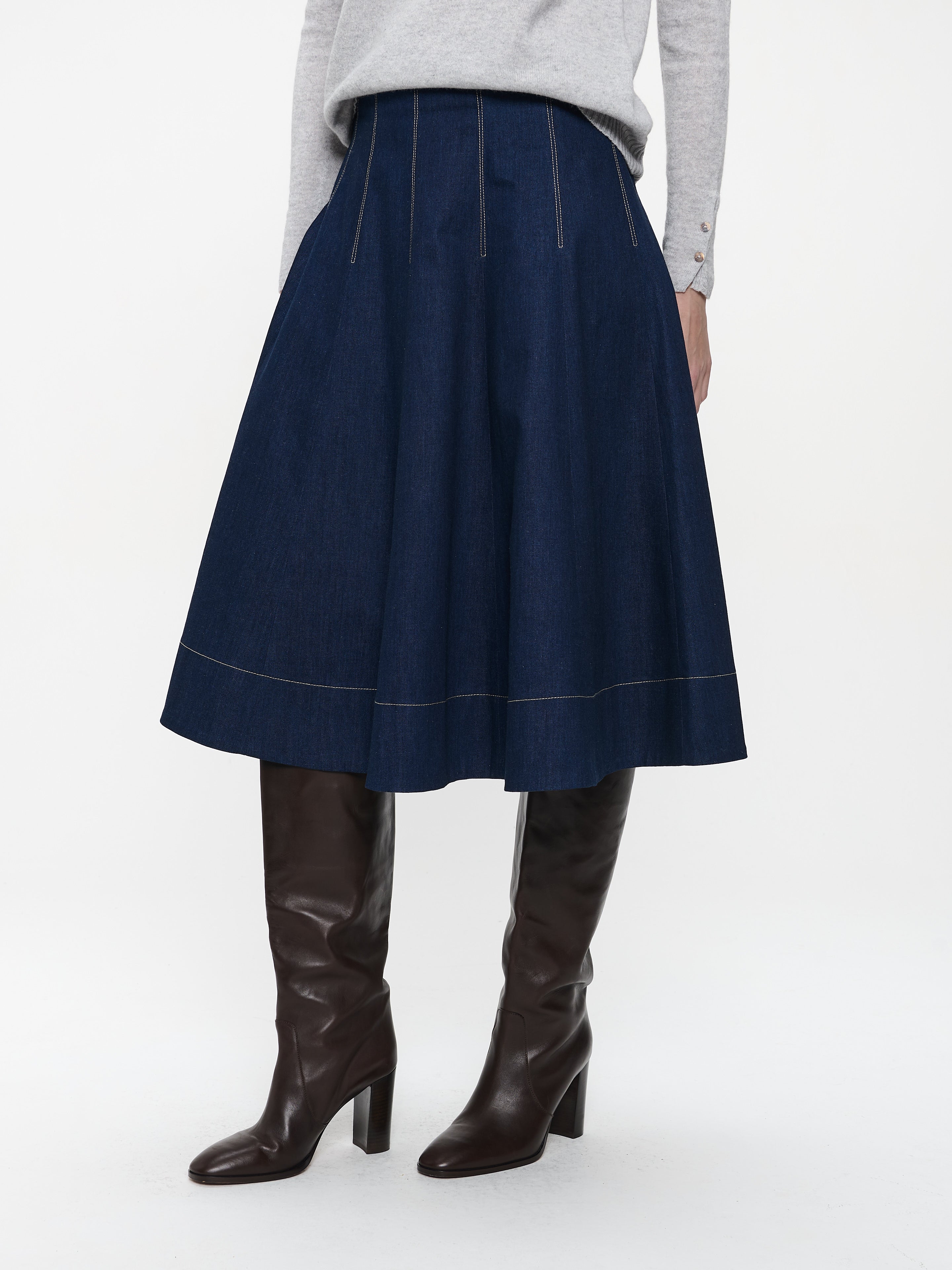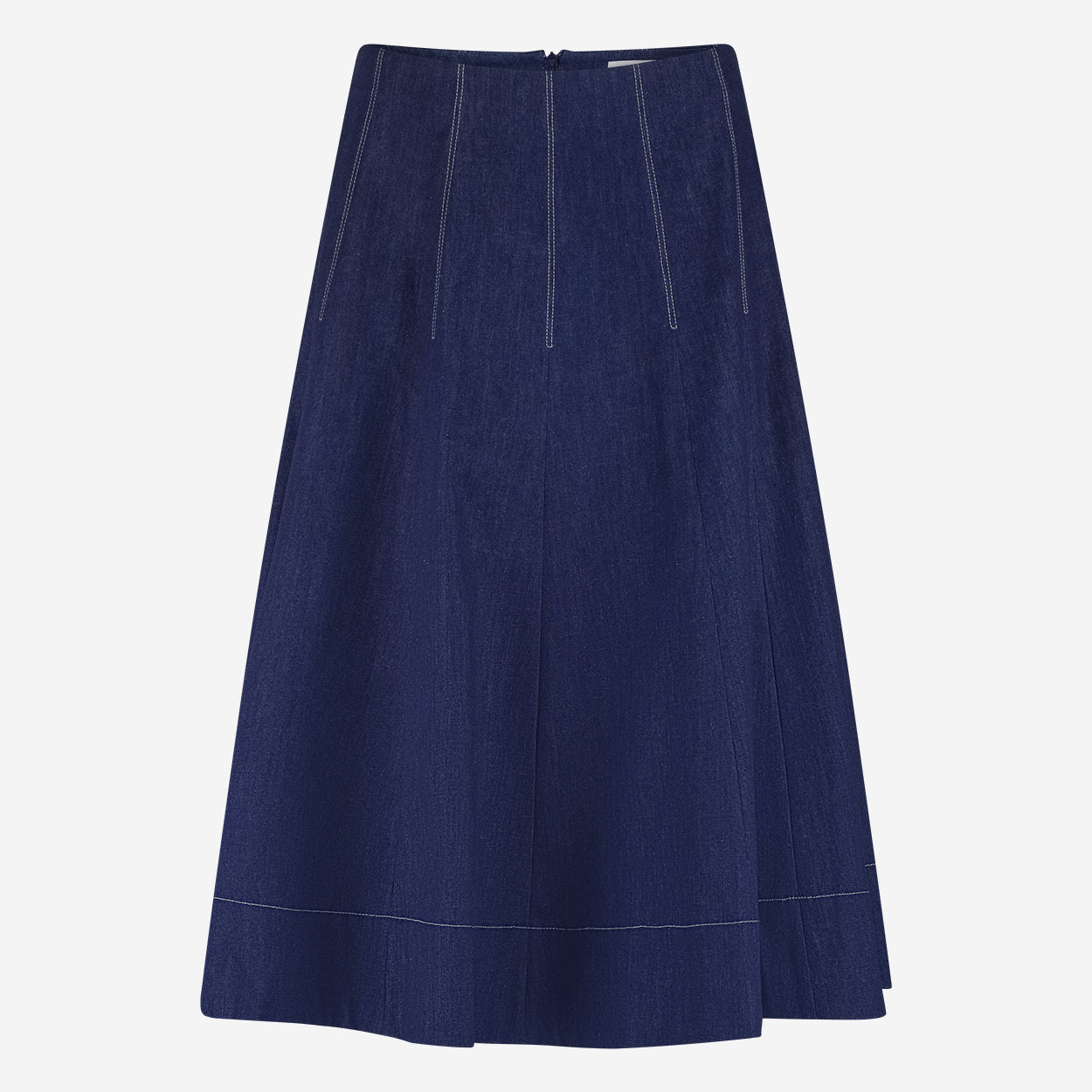A-linje denim Mishele skjørt som kombinerer struktur og femininitet. De synlige sømmer i plisseringene gir visuell interesse og form, mens midi-lengden og den mørke indigo-fargen gir tidløs eleganse. Kombiner den med myke strikkeplagg eller skreddersydde skjorter for allsidig styling gjennom sesongen.