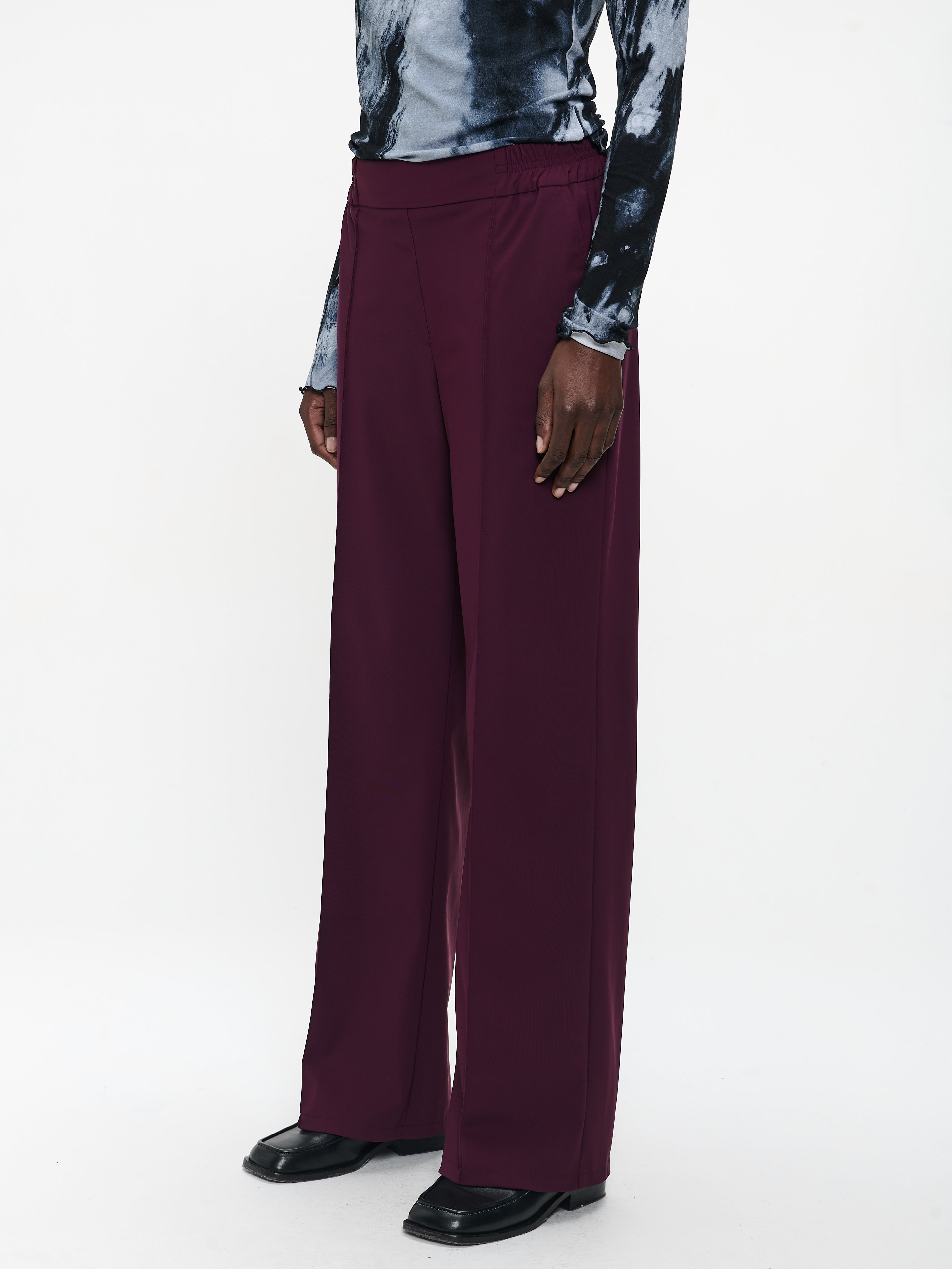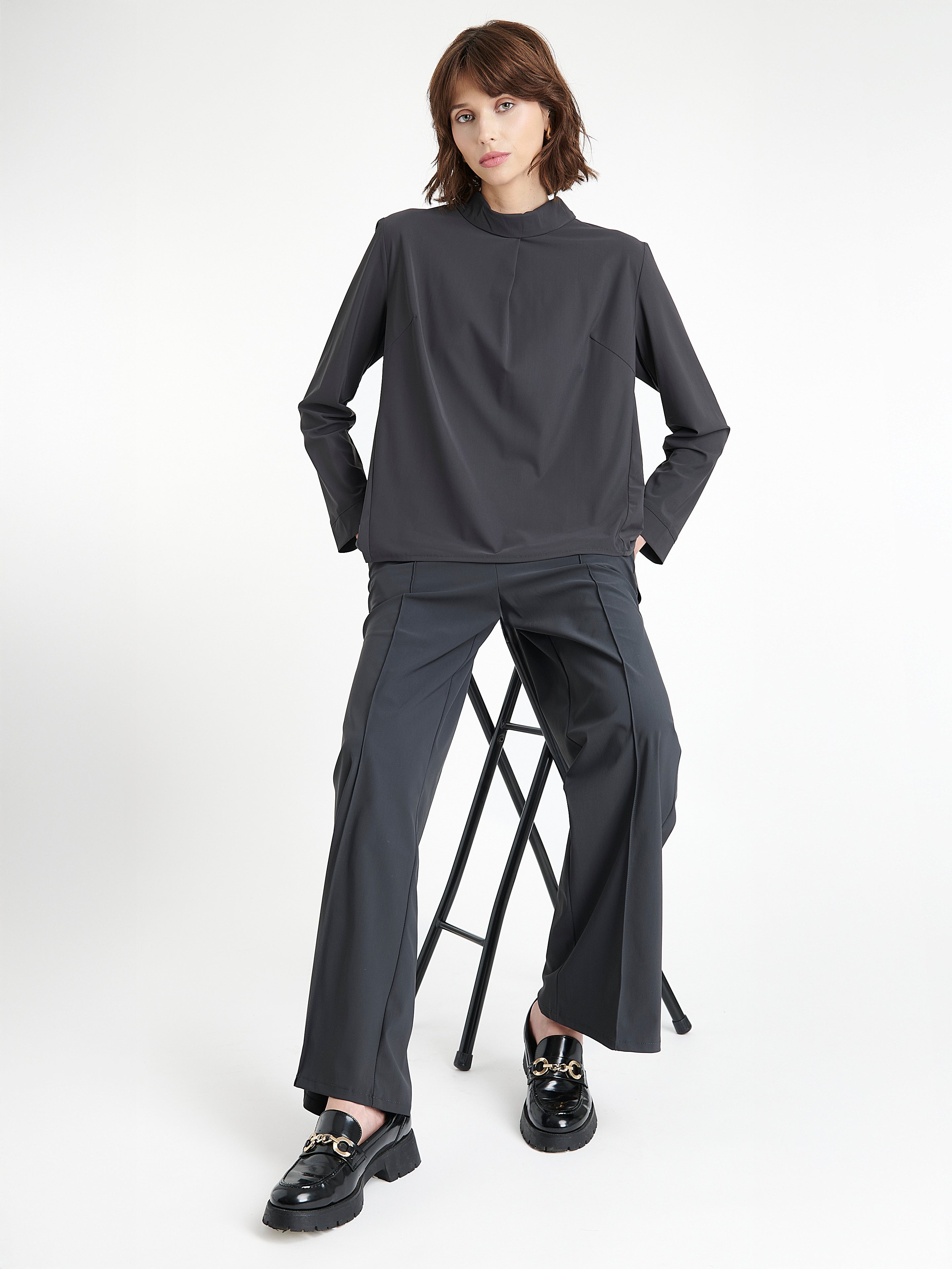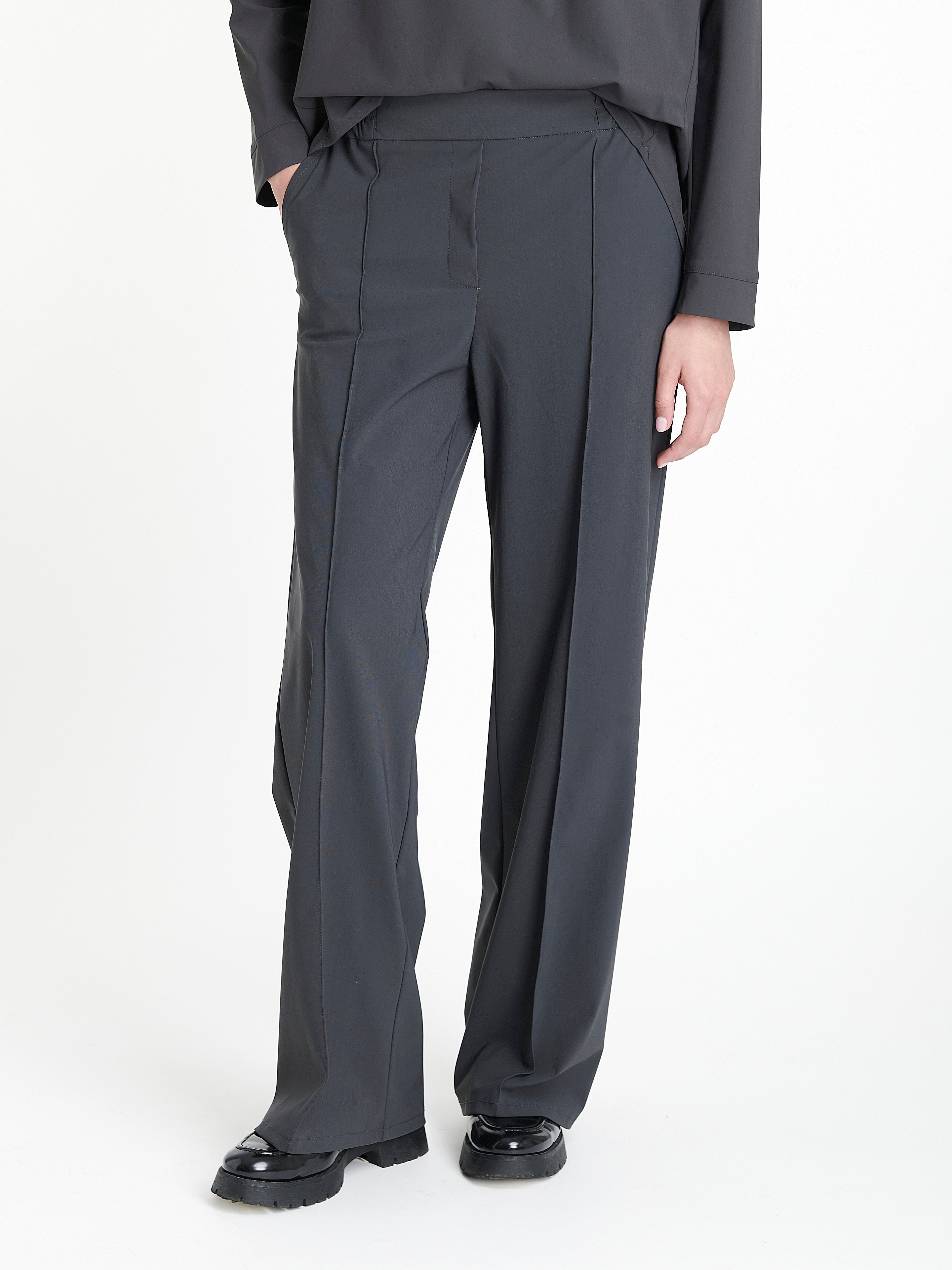 Thera-buksen kombinerer eleganse og funksjonalitet med en strømlinjeformet silhuett og skreddersydde detaljer. Den er laget av børstet teknisk jersey, som føles myk mot huden og gir en lett struktur. Den vide benformen og pressede foldene gir et stilig uttrykk, mens mid waist-linningen sikrer komfort gjennom hele dagen — perfekt for kontoret eller mer formelle anledninger.