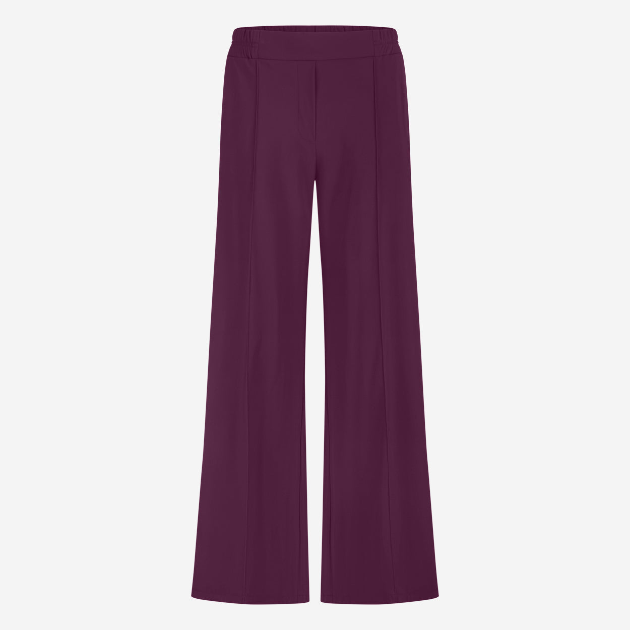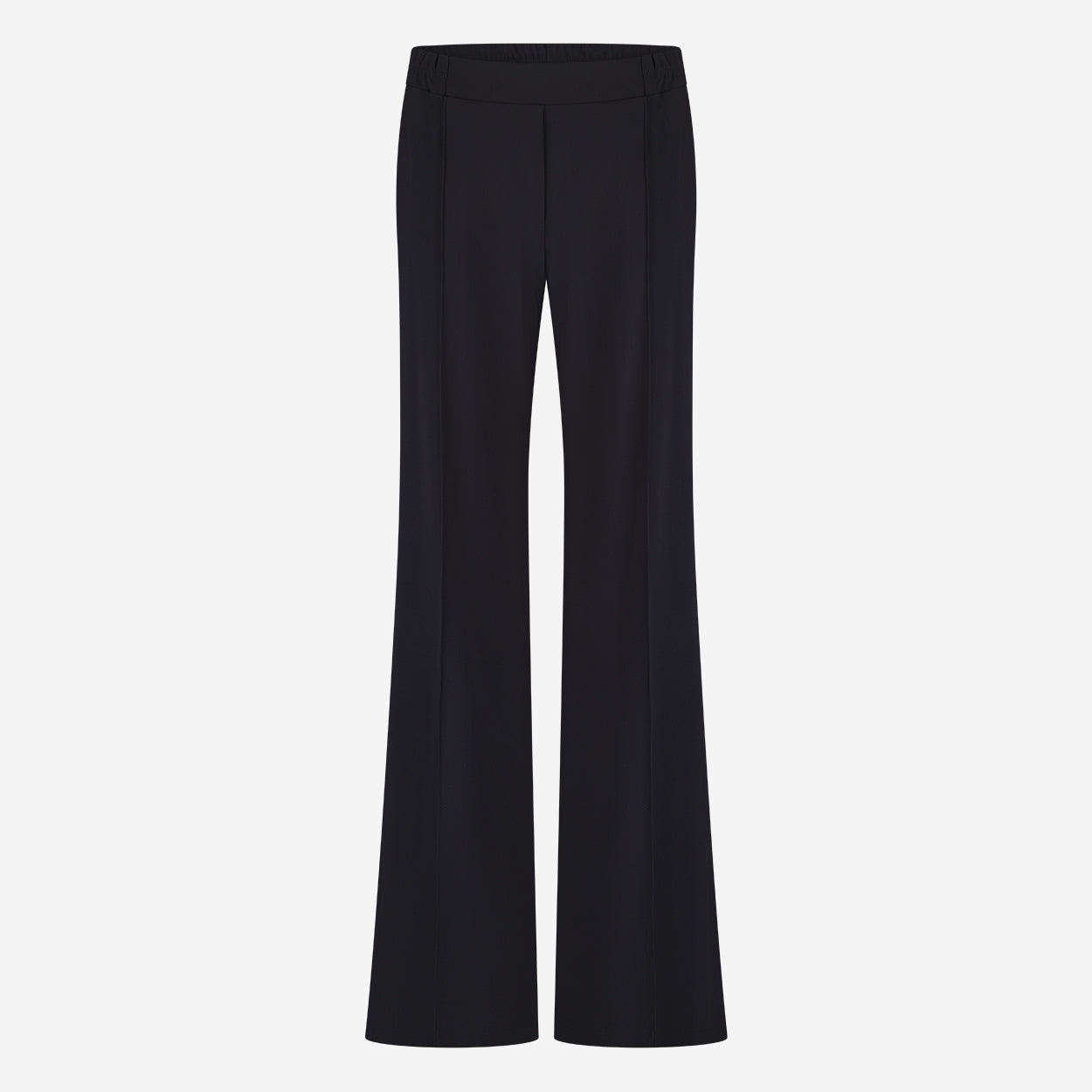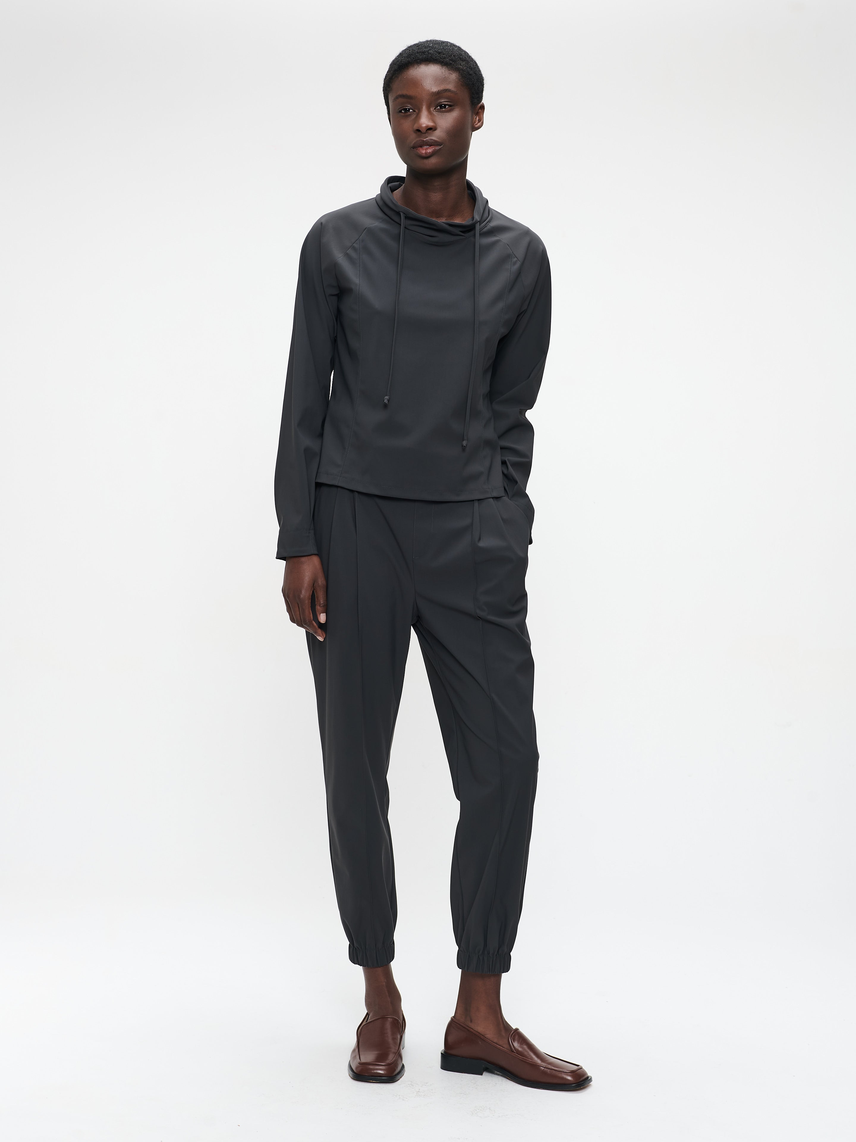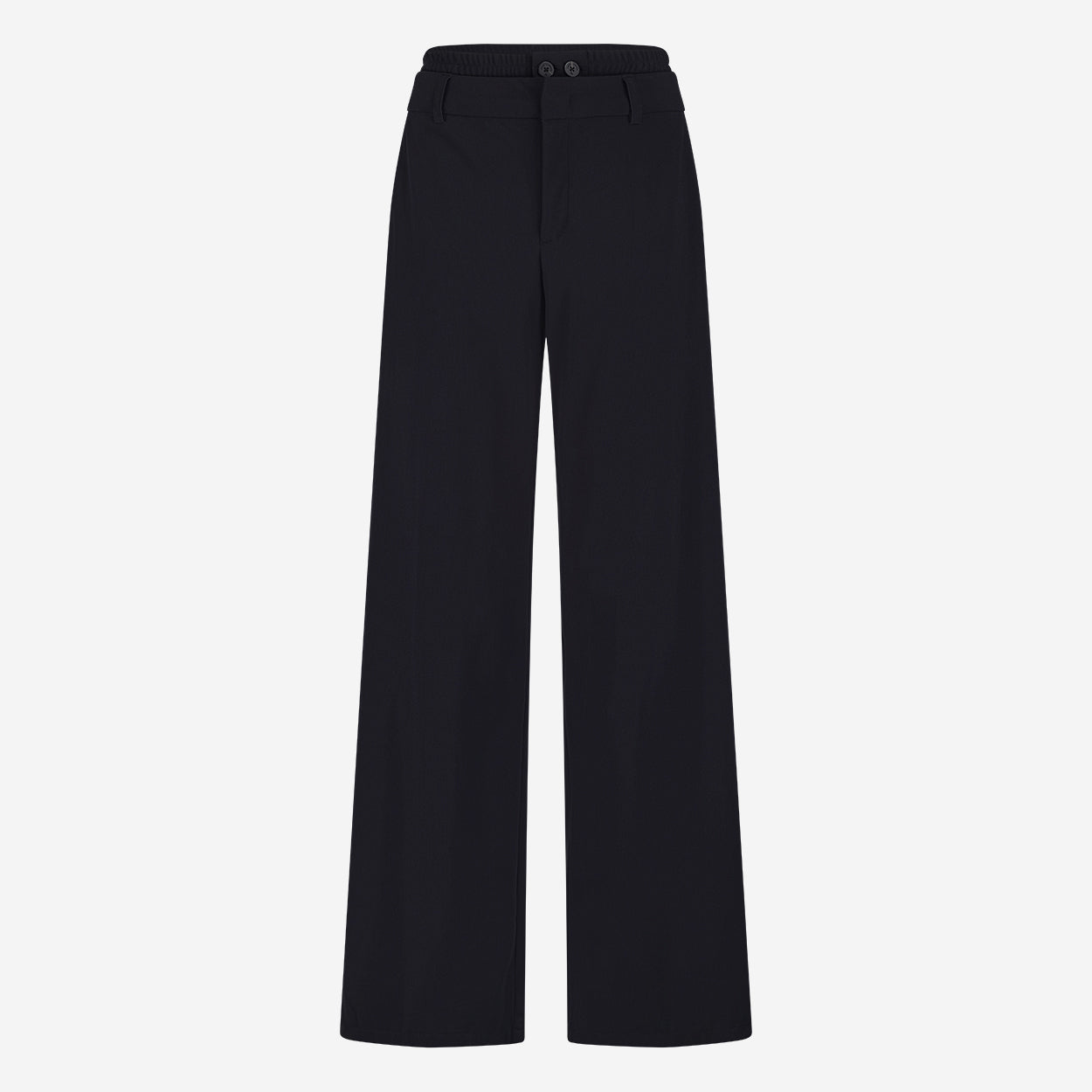 Thera-buksen kombinerer eleganse og funksjonalitet med en strømlinjeformet silhuett og skreddersydde detaljer. Den er laget av børstet teknisk jersey, som føles myk mot huden og gir en lett struktur. Den vide benformen og pressede foldene gir et stilig uttrykk, mens mid waist-linningen sikrer komfort gjennom hele dagen — perfekt for kontoret eller mer formelle anledninger.
